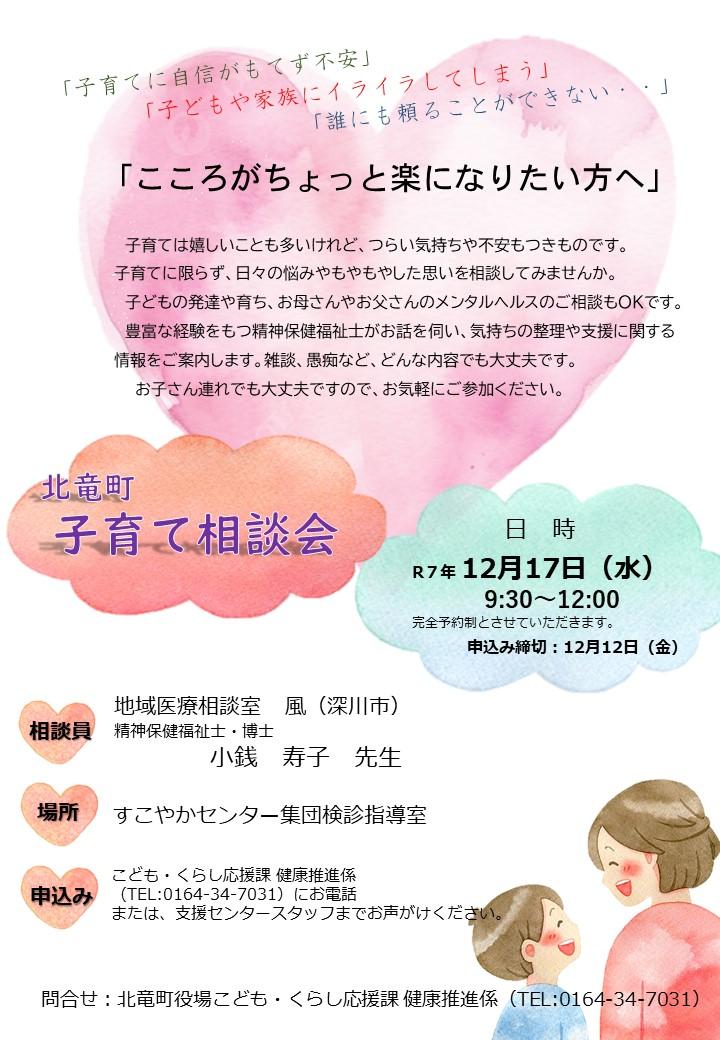 精神保健福祉士の小銭先生を相談員に招き、すこやかセンターにて子育て相談会を実施します。